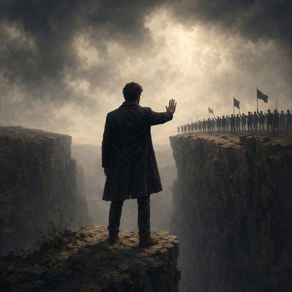Un hombre se detiene al borde del abismo. No avanza, no retrocede: marca un límite. Del otro lado, la multitud espera. Aquí comienza la rebelión verdadera: no en el grito, sino en el punto donde alguien se atreve a decir “hasta aquí”.